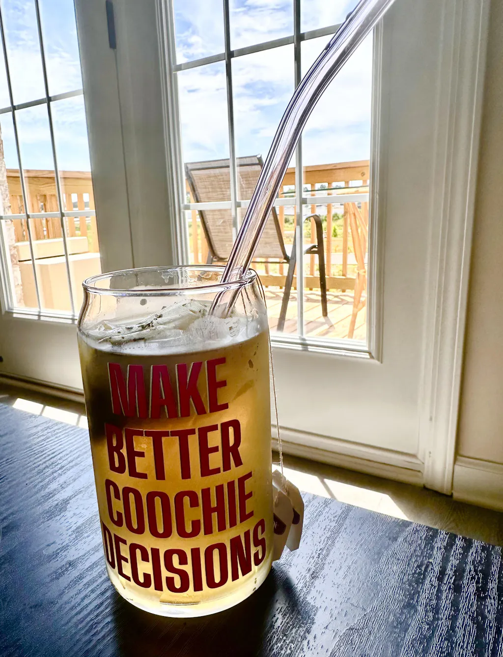 Let me just say that I did not make the best decisions this year and when I seen this glass it really spoke to me. Its made me realize that you have to be a Choosy Lover. Definitely wish it had a straw/lid but I love it nonetheless.